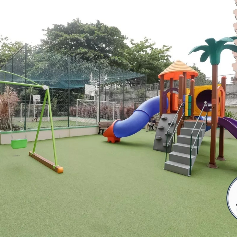 Playground, Piscina, Churrasqueira, Quadra esportiva, Academia, Salão de festas, Sauna, Brinquedoteca, Corrimão, Piso tátil, Rampas de acesso, Salão de jogos, Vaga de garagem acessível, Área verde, Elevador, Portaria 24h